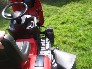 La souplesse de la commande hydrostatique au pied, rien à redire de ce coté, le régime moteur par une manette à coté du volant et le réglage de la hauteur, tout est fonctionnel vous pouvez même poser votre soda et votre paquet de cigarette, attention quand même sur terrain accidenté cela secoue..Une pédale de frein efficace devant permettre la position parking, heu !! la petite manette pour verrouiller cette position m'est restée dans les mains dés la première utilisation..