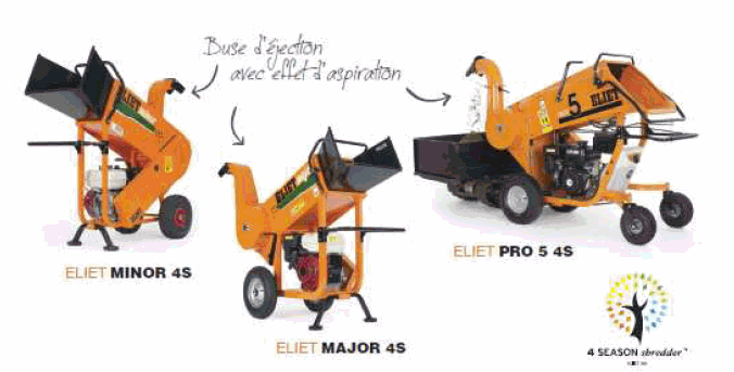 Les nouveaux broyeurs MINOR 4S et MAJOR 4S de la gamme de plaisance ELIET, ainsi que le PROF 5 de la gamme professionnelle comportent désormais une buse d’éjection des copeaux qui permet de les souffler en hauteur, à l’endroit choisi. Contrairement à d’autres broyeurs dotés d’un système d’éjection des copeaux classiques, les broyeurs ELIET 4S (comme 4 Saisons) sont parfaitement polyvalents. Ils peuvent ainsi parfaitement traiter les déchets verts humides, sans risque de boucher la turbine.