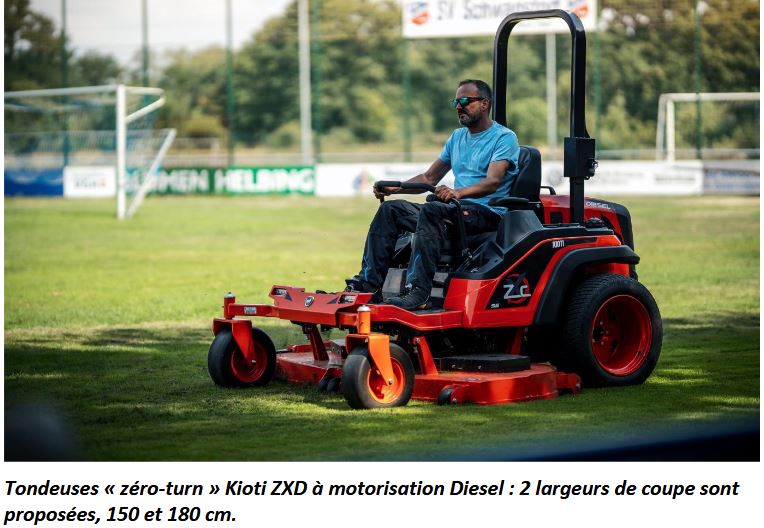 Fort d’une demande croissante pour des utilisations commerciales intensives, le fabricant coréen Kioti lance deux tondeuses professionnelles à rayon de « braquage zéro » à motorisation Diesel. Dotées d’une table de coupe de 150 ou 180 cm de large, les tondeuses de la gamme ZXD disposent d’un moteur Diesel de 1233 cm3. Ce trois cylindres de 25 chevaux - de conception 100% Kioti - est bien entendu conforme aux dernières normes anti-pollution. Les professionnels de la tonte apprécieront aussi la transmission directe par cardan, le carter acier renforcé et la compacité des ZXD. L’essieu avant est articulé et la conception du poste de conduite réduit drastiquement 2/3 les vibrations transmises au conducteur. Ces machines premium sont à retrouver dans le réseau de revendeurs Kioti et sont garanties 2 ans.